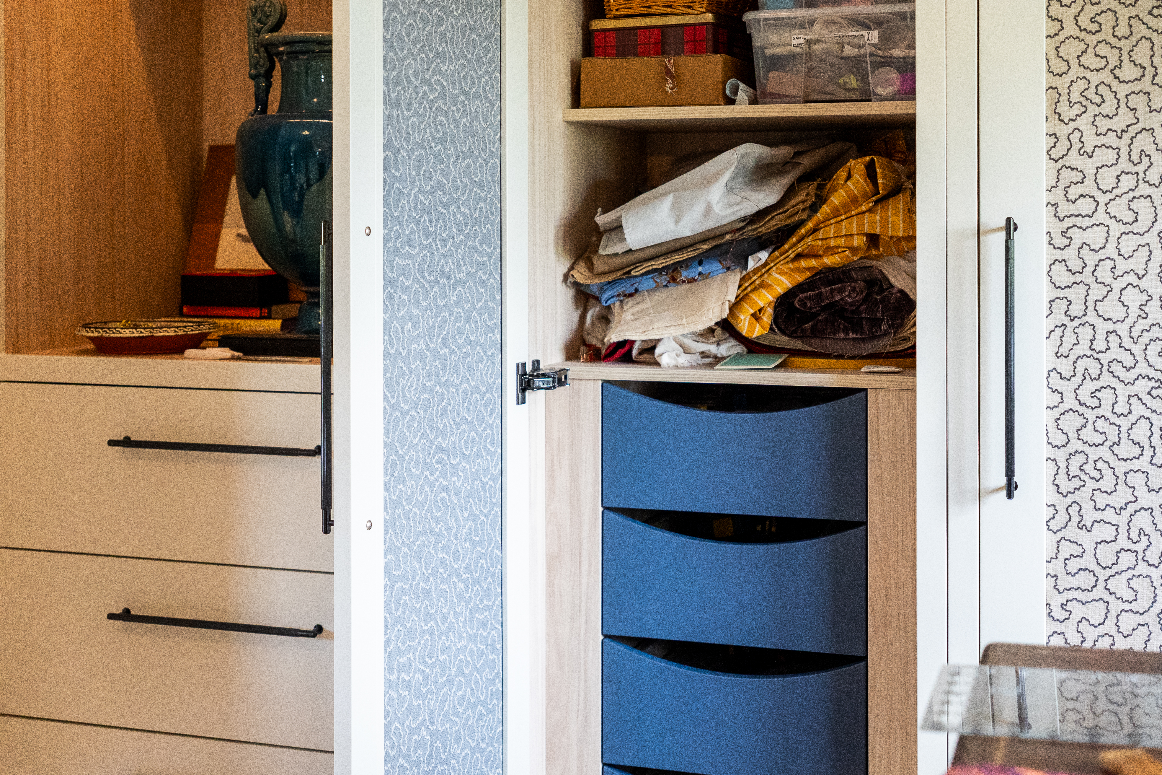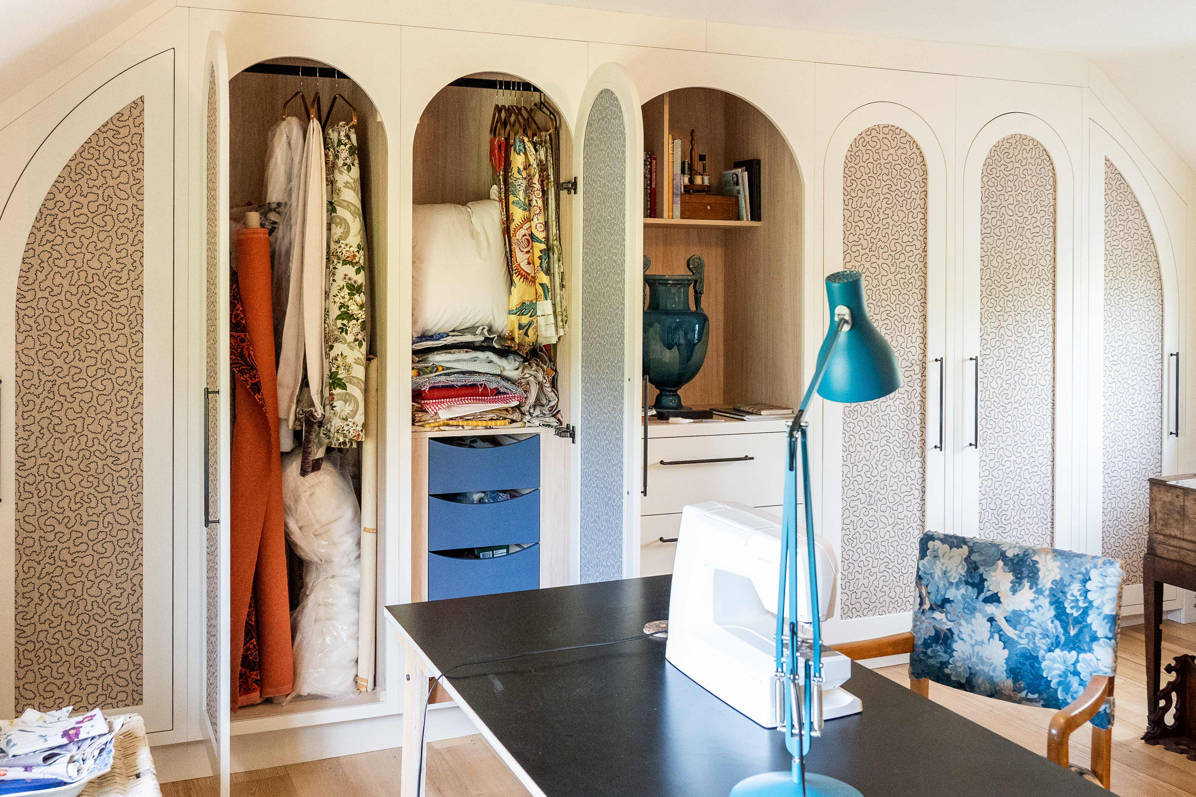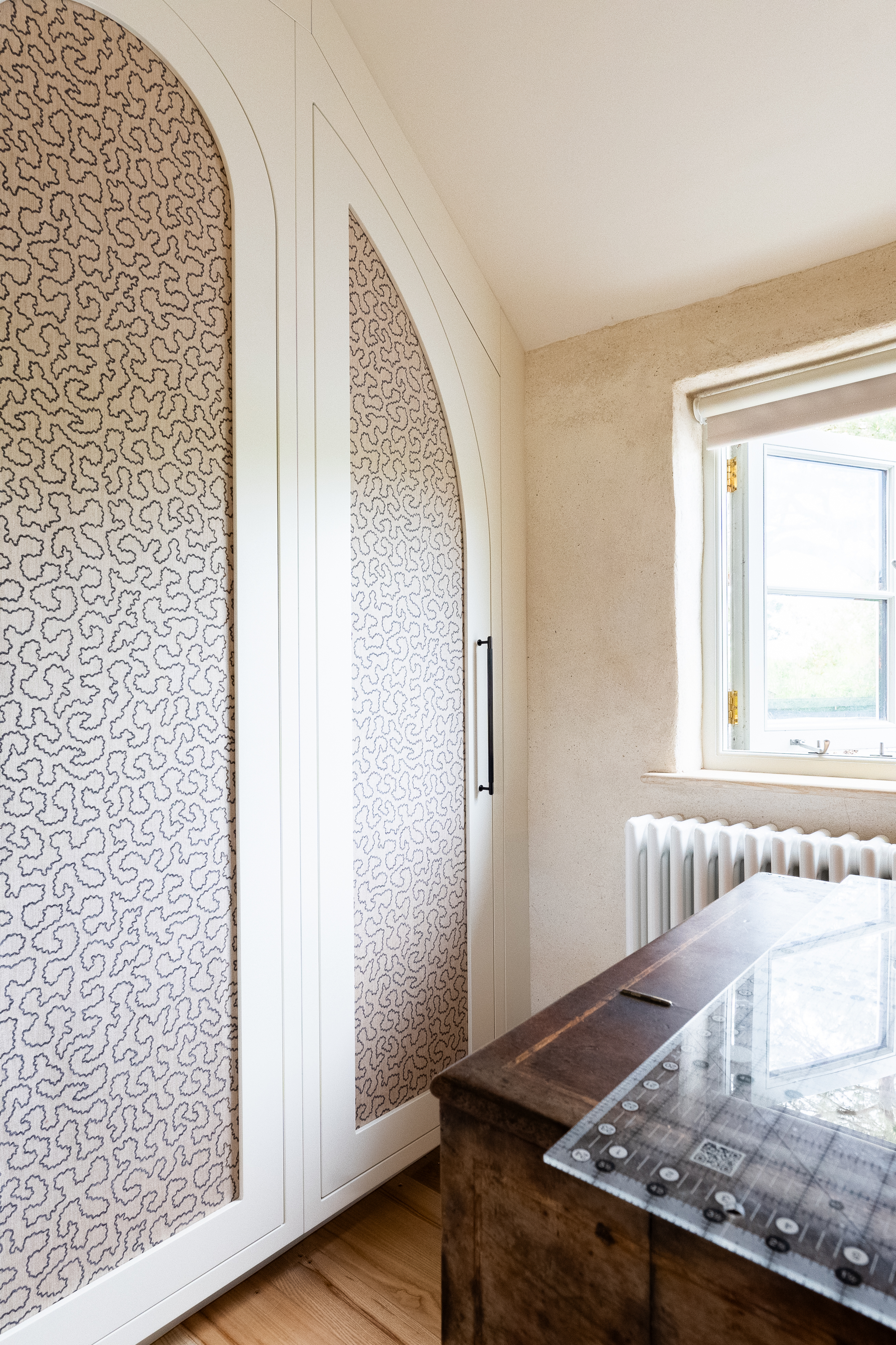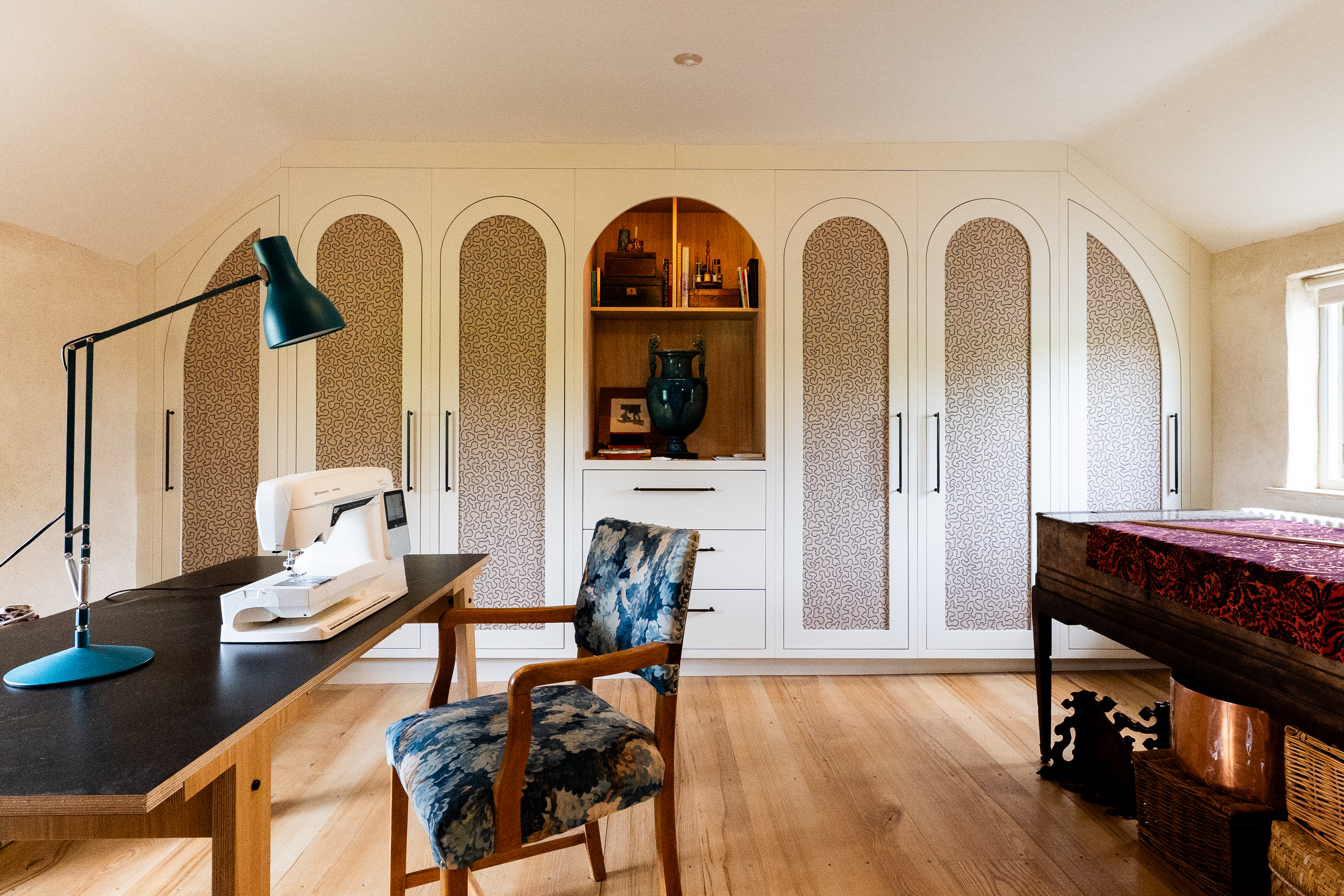 A dream project for a client who needed a stylish yet practical solution for her growing collection of sewing supplies. From fabric rolls and threads to tools and mannequins, we designed a bespoke haberdashery cupboard with a place for everything. We added breathable fabric panels to the doors – not only to keep things fresh but to add a lovely bit of texture and softness to the look. It’s now a hardworking, beautiful feature in her creative space.