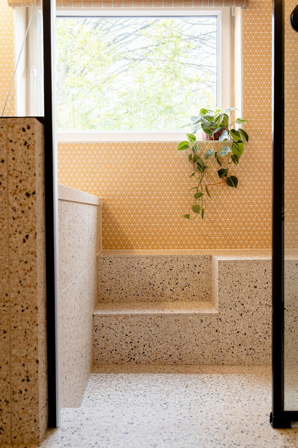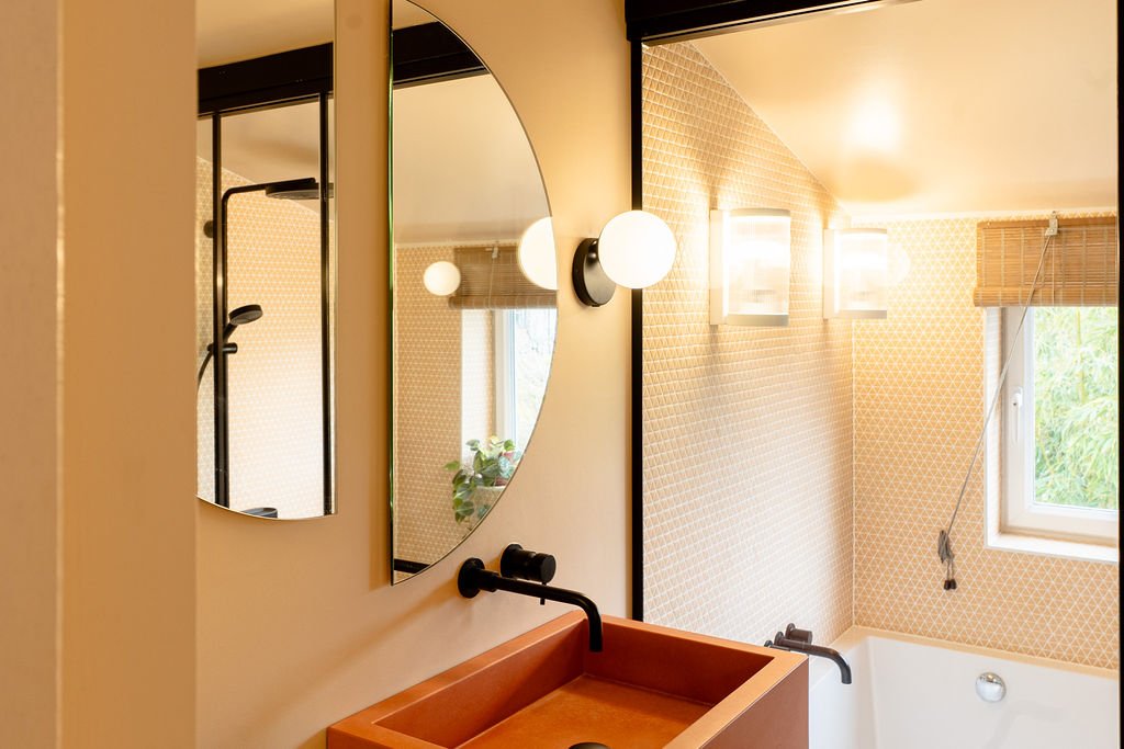 The clients wanted neutral tones with character and depth. Soft peachy pink tiles and paint create intimacy and visual comfort for long soaks, while the small-scale triangular mosaics add subtle texture. The concrete basin introduces a pop of burnt orange to the contemporary palette.