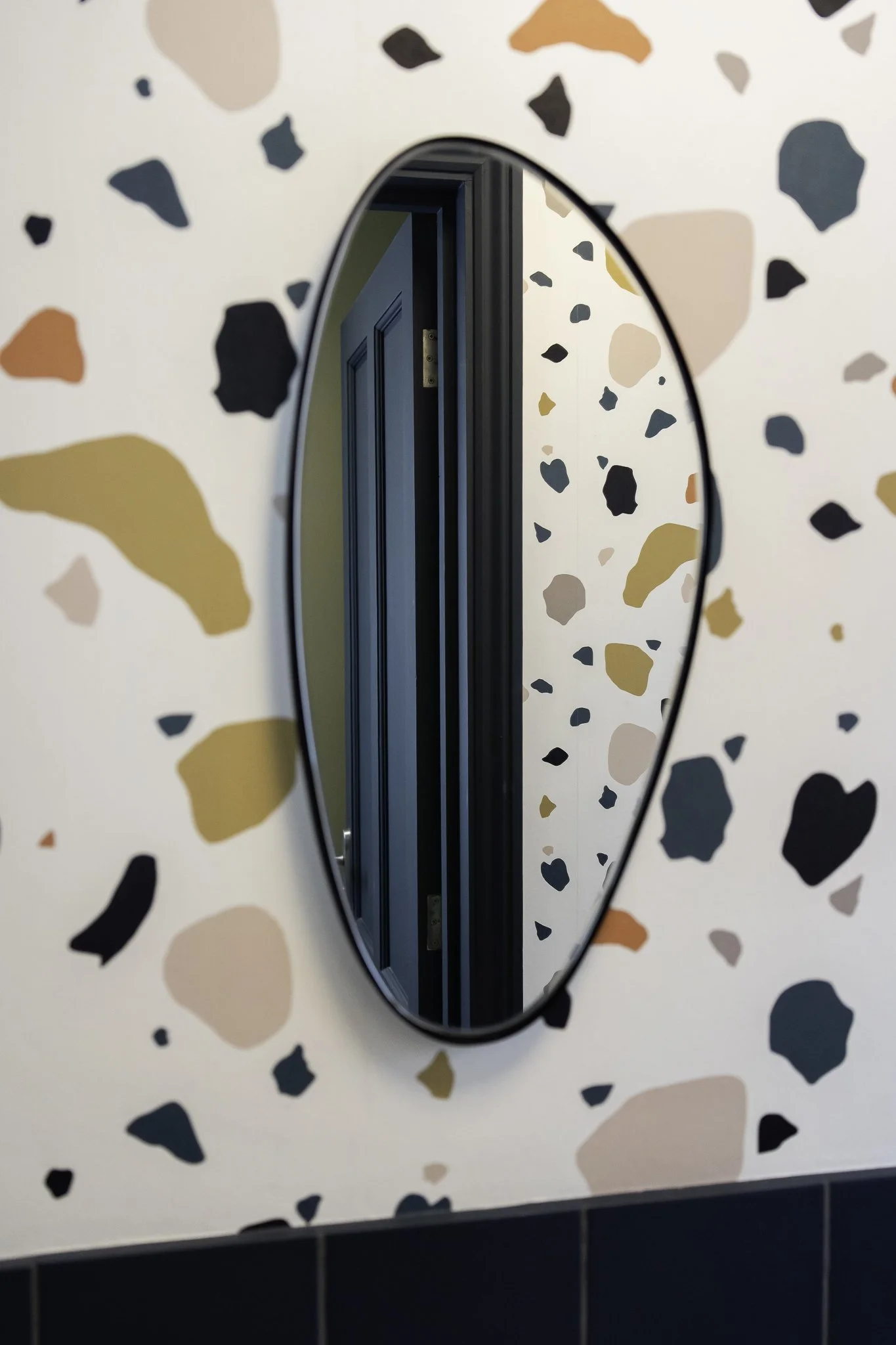 • The downstairs cloakroom and bedroom ensuite have been refreshed with clean and functional design, while playful tiles and wallpaper inject personality and echo the confident colour palette of the home.