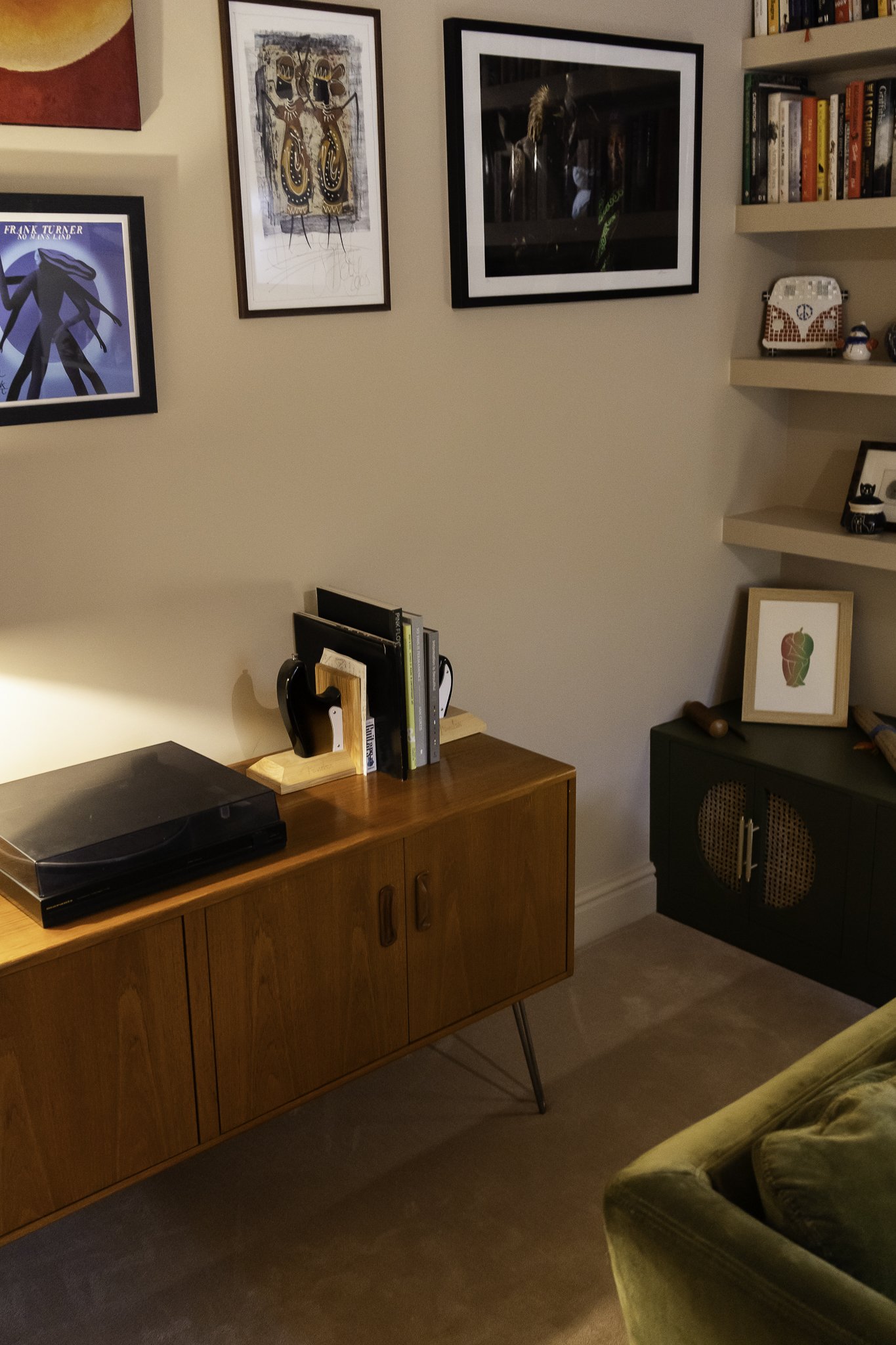 • In the front room and snug, favourite existing furniture was combined with carefully sourced vintage pieces, including a beautiful mid-century sideboard. New sofas, rugs, cushions and thoughtfully displayed artwork brought everything together in a cohesive design.