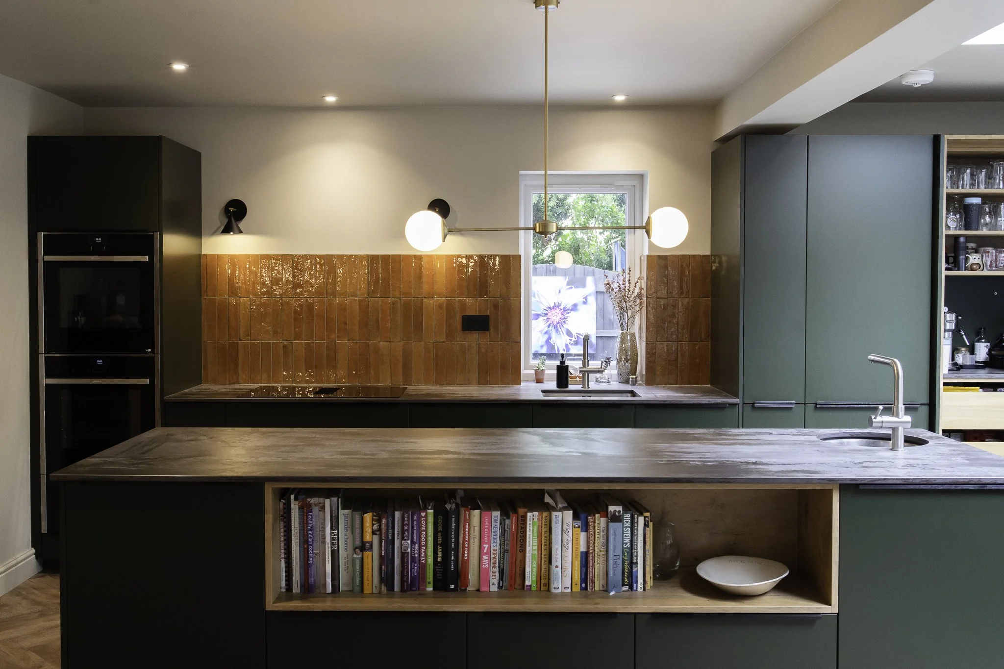 Drawing on colours from nature produces a feeling both impactful and welcoming. Bold green cabinetry paired with burnt orange tiles creates a dramatic yet surprisingly warm palette.